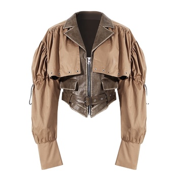 Anszktn mới đến thời trang nâu áo choàng PU Crop puffer Áo khoác mùa đông áo khoác da cho phụ nữ